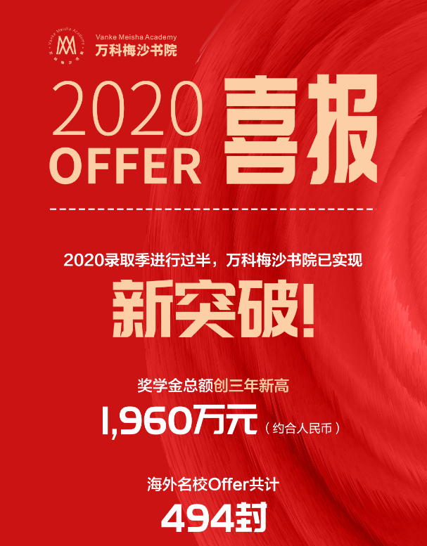 2020申請(qǐng)季還未結(jié)束,梅沙學(xué)子已收獲494封海外名校錄取Offer,獎(jiǎng)學(xué)金累計(jì)約合人民幣1,960萬(wàn)元,創(chuàng)三年新高。其中,來(lái)自美國(guó)Top100綜合性大學(xué)及文理學(xué)院的錄取通知書有356份,來(lái)自美國(guó)Top50綜合性大學(xué)及文理學(xué)院的錄取通知書有180份。