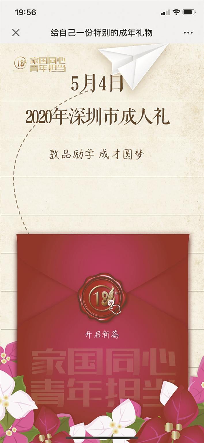 深圳晚報(bào)2020年05月06日訊 5月4日上午,一打開2020年深圳市成人禮線上宣誓典禮的創(chuàng)意H5,深圳市明珠學(xué)校高三學(xué)生張栩一下子便感受到了儀式的莊嚴(yán)和神圣。參加完線上宣誓典禮后,張栩激動(dòng)地說:“感覺很暖心,儀式感很強(qiáng),這是一份特別的‘成年禮物’!”