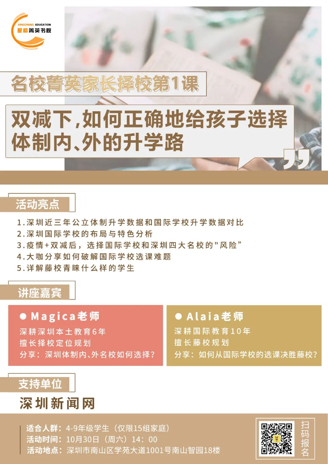 如果家長們在擇校方面有疑問,歡迎參加擇校君第一期【名校菁英家長下午茶】!一起探討:雙減之后,如何正確地給孩子選擇體制內(nèi)、外的升學(xué)路?