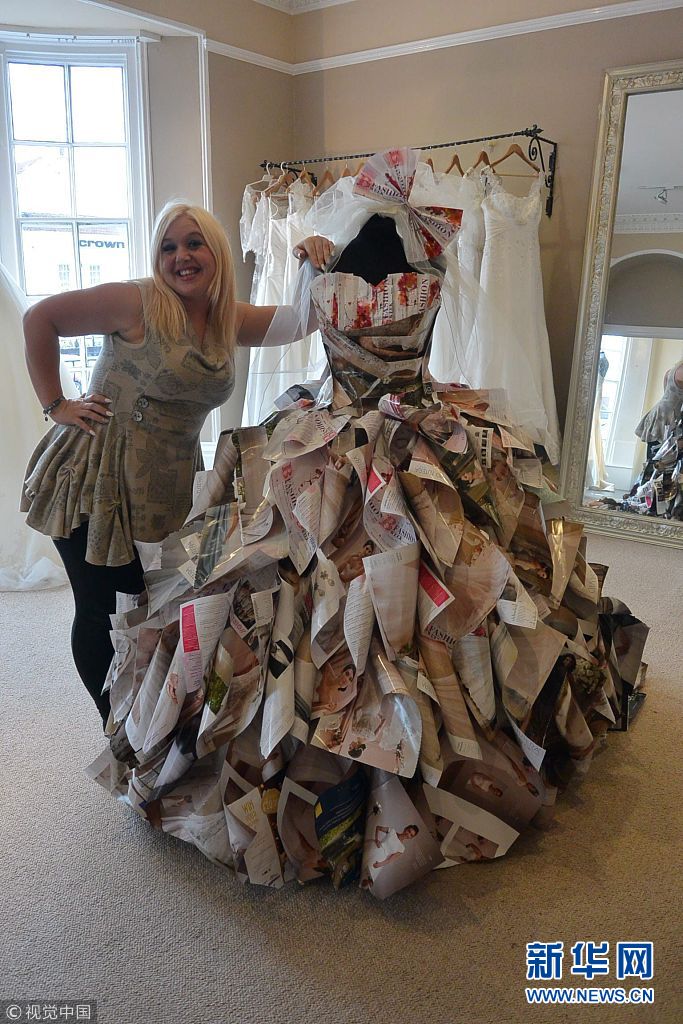 ????2015年3月23日消息(具體拍攝時間不詳),英國,服裝設計師Kelly Currie利用舊的新娘雜志精心制作了一套婚紗,并在Bawtry時裝周閉幕時同其它禮服一起參加了新娘時裝秀。 (圖片來源:視覺中國)