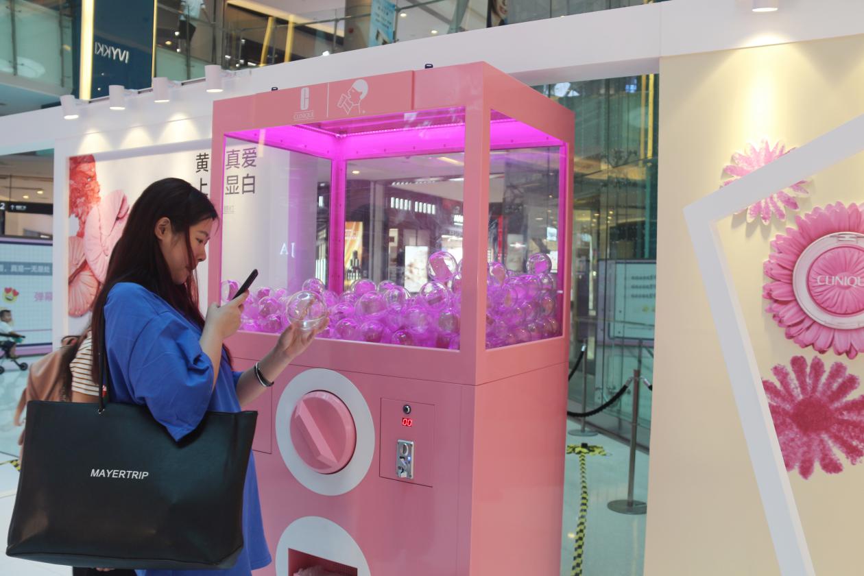 在參與了四個主題拍照區(qū)互動后,即可得免費扭蛋幣一枚。憑此可以到夢幻燈箱墻處碼扭蛋,贏取限量版禮盒,小雛菊腮紅,喜茶免排隊券和喜茶免費贈飲劵等等。