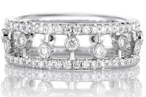 De Beers戴比爾斯Dewdrop鉆石戒指 –112顆鉆石宛若清爽的晨露,輕輕浮動在兩個密鑲18K白金戒環(huán)之間??傊兀?.95克拉。