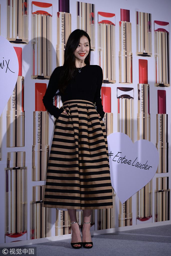 2017年4月5日訊,韓國(guó)首爾,5日,雪莉出席某美妝品牌活動(dòng)。身穿黑色修身緊身針織衫,下穿棕色黑色橫條紋蓬蓬裙,腳穿麂皮金色一字帶魚(yú)嘴細(xì)跟高跟鞋。
