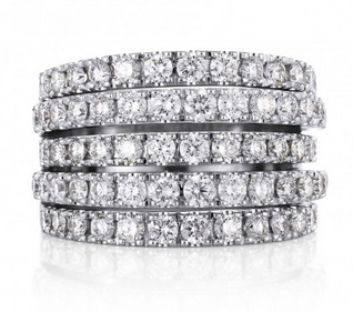 | De Beers戴比爾斯Classic五行戒指 18K白金傳遞著經(jīng)典而現(xiàn)代的時尚宣言??傊?.75克拉。密鑲。戒指寬度:13 mm。 |