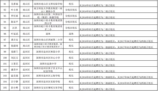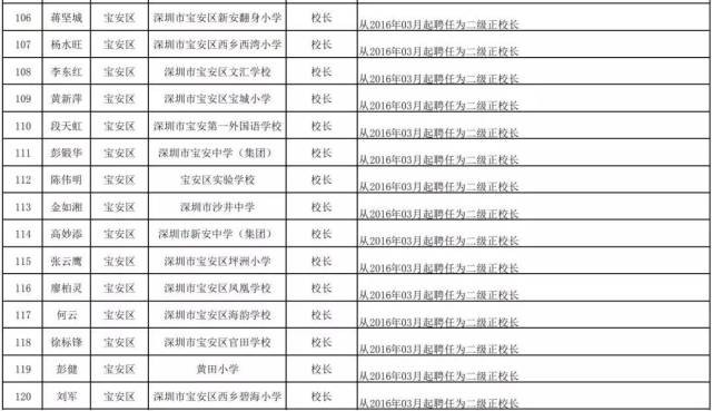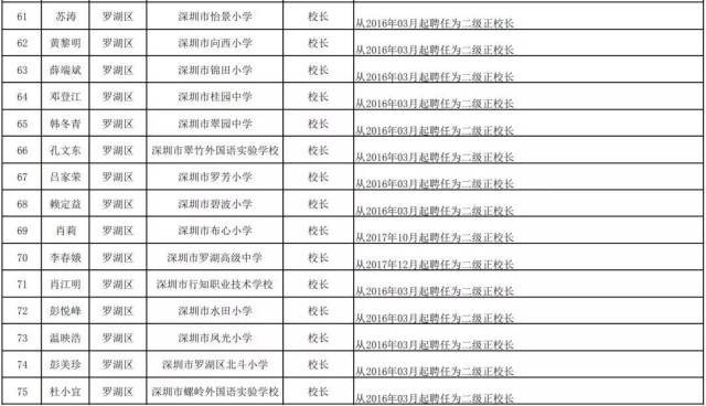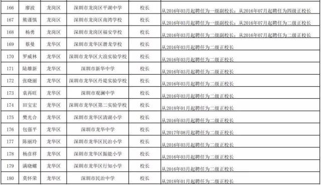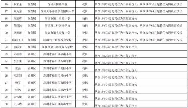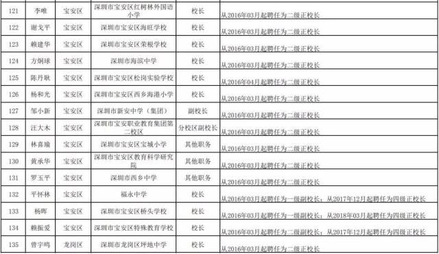 此次公示名單中,職級最高的是二級正校長,特級和一級正校長空缺。此次公示的二級正校長共157人,其中市直屬10人。各區(qū)中,二級正校長最多的是福田區(qū),共有32人,龍崗和寶安緊隨其后,分別有29、27人。羅湖、南山、龍華三區(qū),則分別有19、16和13人。其他各區(qū)的二級正校長均在10人以內(大鵬新區(qū)暫無)。