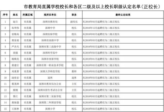 此次公示名單中,職級最高的是二級正校長,特級和一級正校長空缺。此次公示的二級正校長共157人,其中市直屬10人。各區(qū)中,二級正校長最多的是福田區(qū),共有32人,龍崗和寶安緊隨其后,分別有29、27人。羅湖、南山、龍華三區(qū),則分別有19、16和13人。其他各區(qū)的二級正校長均在10人以內(大鵬新區(qū)暫無)。