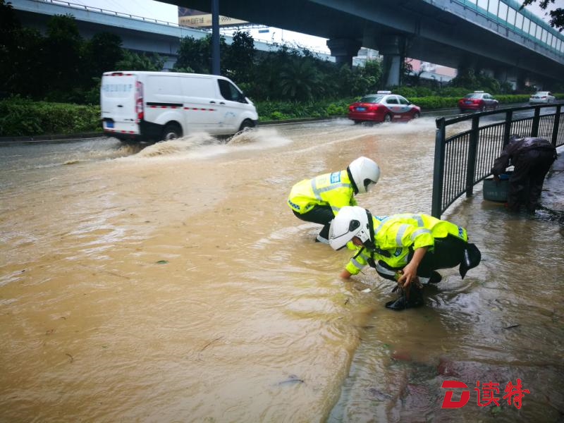 但是,眼前的情況,他們無法視而不見。深鹽二通道下方,羅沙路羅湖公安分局調(diào)頭口處,當(dāng)艾力軍經(jīng)過這里時發(fā)現(xiàn)由于地勢低洼路面已經(jīng)嚴(yán)重積水,他們馬上停下車,疏通下水道。一行人在風(fēng)雨中走進機動車道,沿著路邊只能用手在積水中摸索排水口的位置,將阻塞入水口的樹枝樹葉掏出來。但風(fēng)急雨驟,道路積水水位剛下降一點,剛被清理的下水道又堵樹葉、樹枝等雜物堵上,他們只好不斷地進行著重復(fù)的動作。而此時,臺風(fēng)“山竹”距離深圳接近130公里,羅湖片區(qū)測得最大陣風(fēng)達16級。