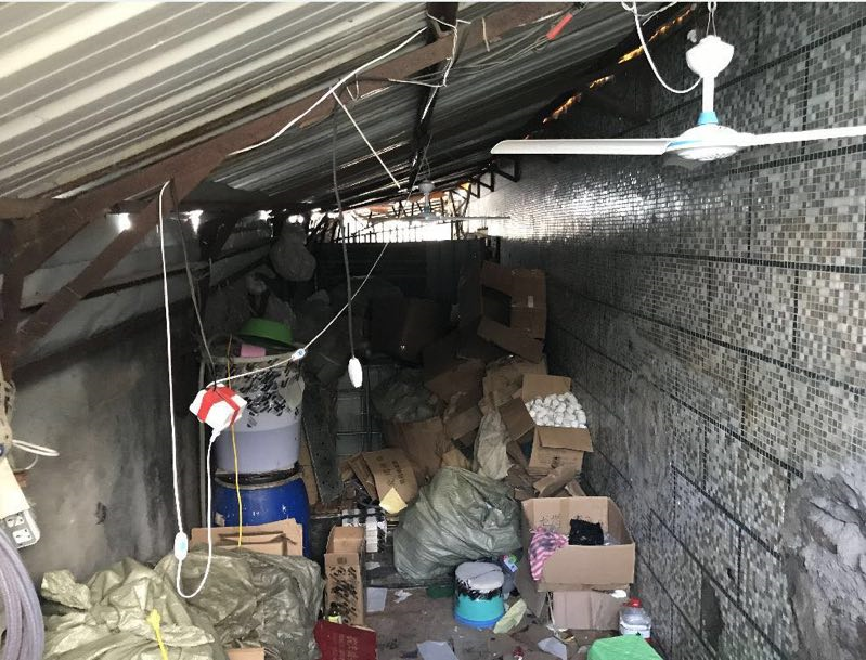 執(zhí)法人員來到位于龍東社區(qū)同昌路的一個(gè)工業(yè)區(qū)進(jìn)行突擊檢查。剛進(jìn)入該工業(yè)區(qū),執(zhí)法人員就發(fā)現(xiàn)有幾間鐵皮房大門緊鎖,通過門縫還能看到大量各品牌的洗衣粉、消毒液,以及各式設(shè)備數(shù)臺(tái)。經(jīng)檢查,現(xiàn)場共有這類鐵皮房3個(gè),分散在工業(yè)園區(qū)3個(gè)不起眼的角落,占地面積超過200平方米。鐵皮房內(nèi)環(huán)境惡劣、電線亂搭,地上堆滿各種標(biāo)識(shí)的加工原料以及各種日化品牌的包裝袋,數(shù)量巨大。