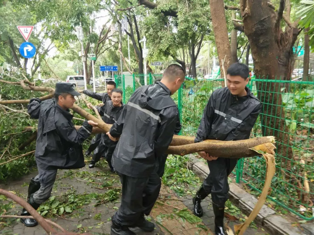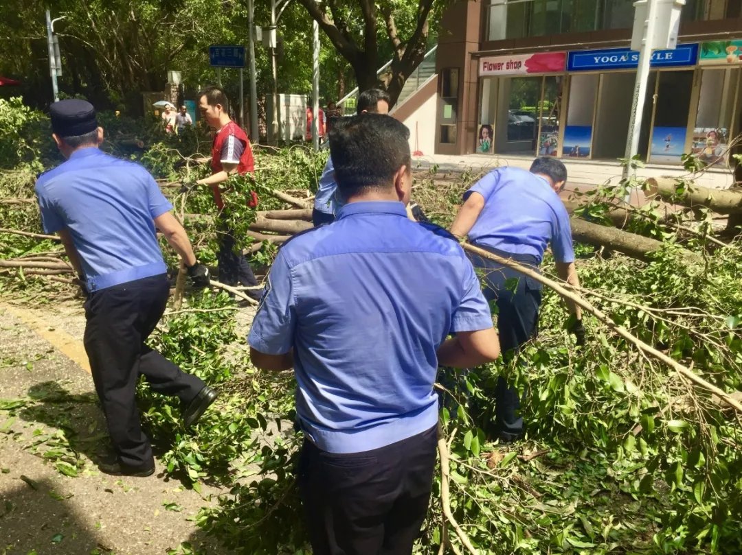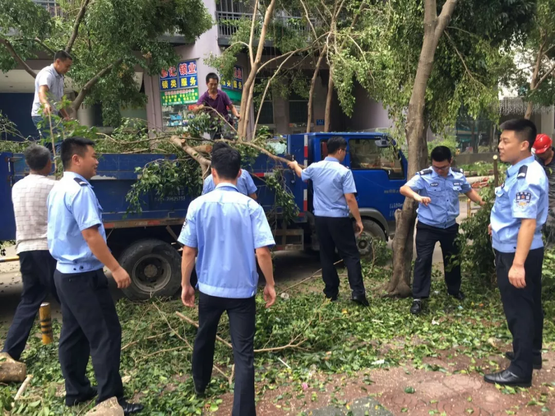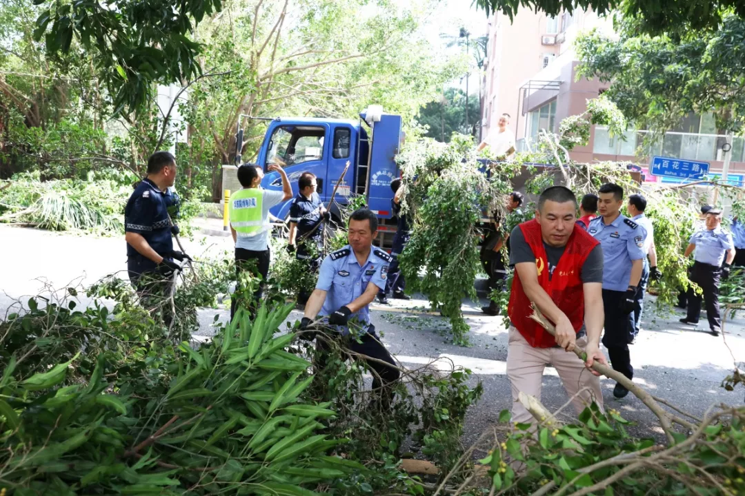 9月19日上午,福田區(qū)百花二路、三路,60多名身著藍色制服的警察和紅色馬甲的輔警格外顯眼,他們正在揮汗如雨地進行災后路障清理工作。