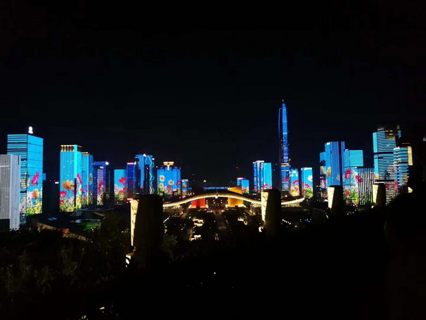 這臺(tái)別開生面的晚會(huì),主舞臺(tái)設(shè)在市民中心廣場(chǎng),舞臺(tái)后方呈現(xiàn)著深圳市精心打造的福田中心區(qū)43座樓宇燈光秀,五彩斑斕、綺麗多姿的深圳城市新夜景,與晚會(huì)現(xiàn)場(chǎng)舞臺(tái)融為一體,為市民和廣大觀眾呈現(xiàn)出一個(gè)迷人的“深圳之夜”。