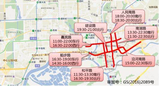 華強北路(13:30-17:00南行,10:00-17:30北行),華富路(17:00-21:00南行,16:00-17:30北行),振華路(16:00-19:00東行,13:30-22:30西行),上步中路(15:00-17:00北行),深南中路(16:00-19:00東行),上步南路(10:00-19:30南行,13:00-15:00北行,19:30-22:00北行)。