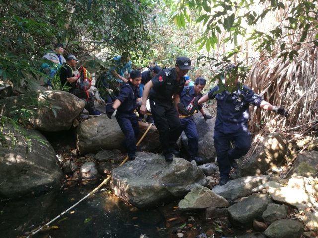 到現(xiàn)場(chǎng)后,民警了解發(fā)現(xiàn)該男子在爬山的過程中不小心踩到苔蘚摔倒受傷,當(dāng)場(chǎng)倒地不起,無法動(dòng)彈。情況緊急,四周山路陡峭,120急救人員短時(shí)間內(nèi)難以到達(dá)進(jìn)行救治。這時(shí),葉孟庭等民警當(dāng)機(jī)立斷,將同行救援隊(duì)員分成兩組,用擔(dān)架將傷者一步步接力抬下山。此處位于亂石山澗中,隊(duì)員只能齊心協(xié)力抬著擔(dān)架一點(diǎn)一點(diǎn)小心挪移,坡陡石滑,空氣悶濕,加之荊棘擋道,隊(duì)員們汗如雨下,整整花了2個(gè)多小時(shí)才將擔(dān)架安全抬到盤山公路懸崖邊,隊(duì)員們個(gè)個(gè)衣衫濕透,手腳上的擦劃痕跡清晰可見。