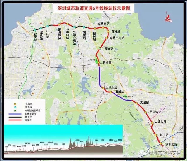 深圳地鐵6號線全長約49.4km,其中一期工程長約37.6km,起自深圳北站綜合交通樞紐,終于松崗站,設(shè)車站20座(其中地下站5座,高架站15座),與4、5、11、13、15號線及廣深港客運專線綜合換乘。