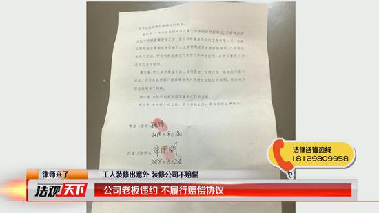 事件發(fā)生后,在記者和龍華區(qū)大良社區(qū)工作站的調解下,工人朱先生和蜂巢裝飾有限公司雙方達成了一致的賠償協(xié)議。蜂巢裝飾有限公司的老板陽鋒承認朱先生是在其承接的工程施工現(xiàn)場受傷,并承諾給朱先生10萬元的賠償金。在賠償協(xié)議書上,雙方明確約定10萬元的賠償金分兩次支付給朱先生。一次是今年9月10號,支付給工人朱先生7萬元賠償金。一次是今年12月31號,支付3萬元賠償金。但是9月10號已過,工人朱先生仍然沒有收到蜂巢裝飾有限公司的賠償金,這時的他有些著急了。