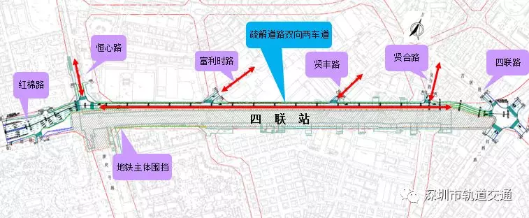 四聯(lián)站位于紅棉路與橫崗一號(hào)路、恒心路交叉口,沿紅棉路東西方向布置,為地下雙層島式車(chē)站(局部三層)。紅棉路為東西向主干道,規(guī)劃路寬50m,現(xiàn)狀路寬35m,雙向6車(chē)道,車(chē)流量較大。車(chē)站北側(cè)為新城匯商場(chǎng),西北側(cè)為康樂(lè)幼兒園,西南側(cè)為信義錦繡花園,南側(cè)為康樂(lè)五區(qū)住宅小區(qū),人員相對(duì)密集。