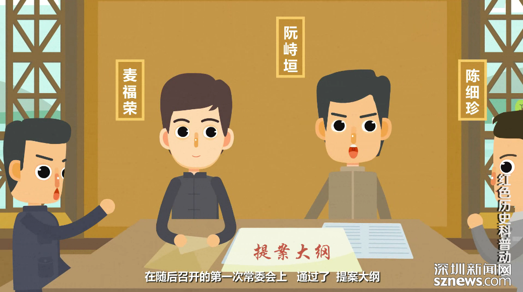 該動(dòng)畫片圍繞中共寶安縣第一次黨員代表大會作了重點(diǎn)講述。1928年2月23日,根據(jù)廣東省委的指示,中共寶安縣委在燕川素白陳公祠召開第一次黨員代表大會。大會認(rèn)真總結(jié)廣州起義失敗的原因和教訓(xùn),克服悲觀主義和盲動(dòng)主義,建立新的領(lǐng)導(dǎo)核心,選舉產(chǎn)生了中共寶安縣第三屆委員會。在隨后的召開的第一次常委會上,通過了《提案大綱》,決定重新整頓各級黨組織,進(jìn)一步發(fā)展黨員;加強(qiáng)宣傳工作,創(chuàng)辦農(nóng)民學(xué)校、夜校、翻印《紅旗》、《布爾什維克》等黨內(nèi)刊物及各種宣傳品。