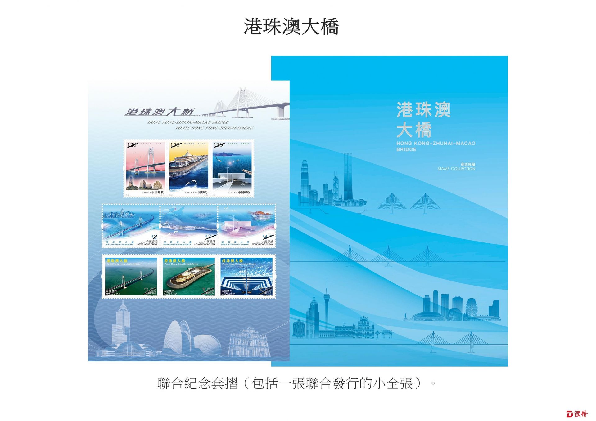 為紀(jì)念大橋啟用,中國(guó)郵政、香港郵政和澳門郵電于同日共同發(fā)行一款聯(lián)合紀(jì)念套折,內(nèi)附一張小全張,嵌有由三地郵政發(fā)行的特別郵票各一套。