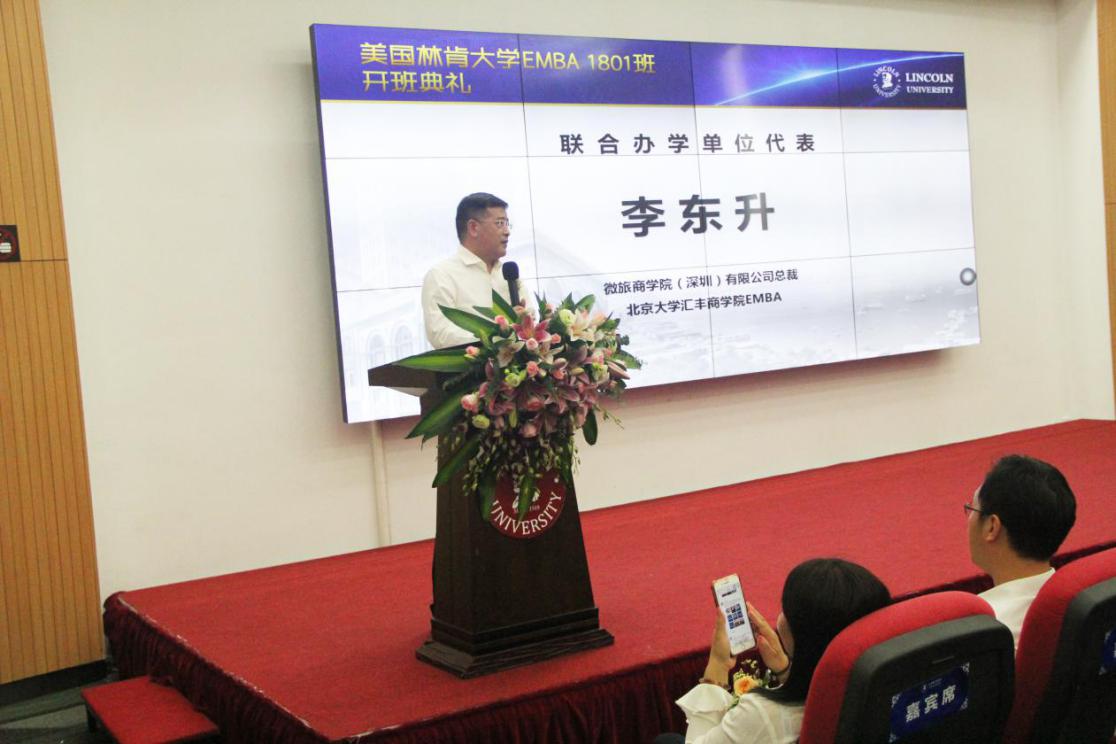 美國林肯大學(xué)的發(fā)展也離不開合作辦學(xué)單位的支持,聯(lián)合辦學(xué)合作單位代表李東升先生,分享了他就讀EMBA的心得,同時也對新教育的理念、新時代企業(yè)發(fā)展的模式提出了自己的見解。