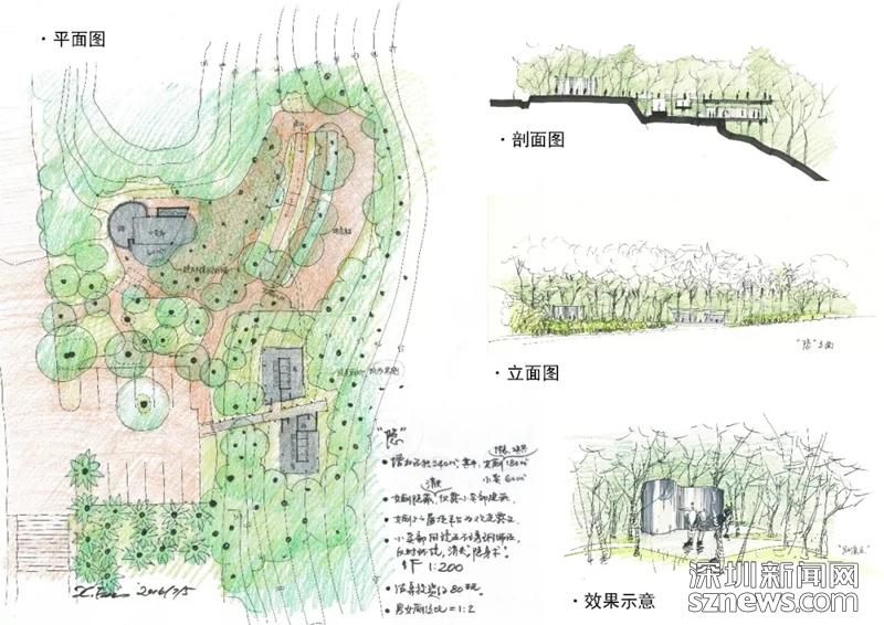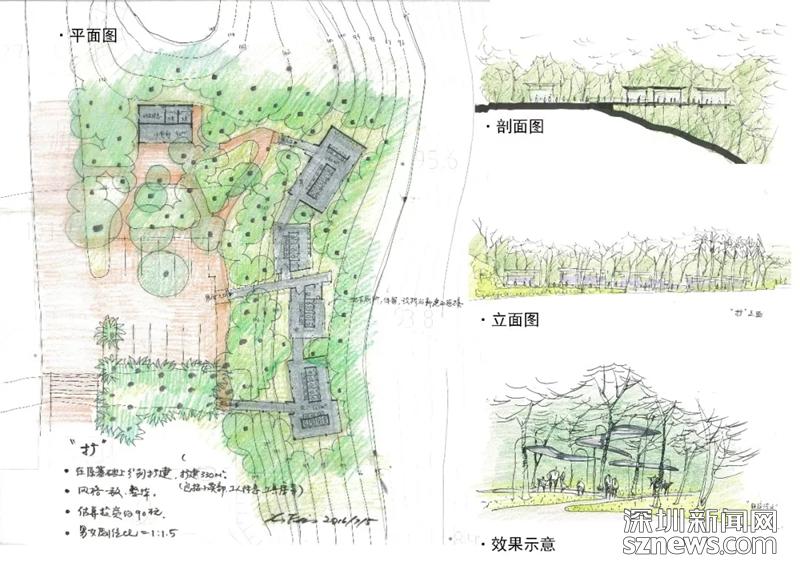 費曉華在文中提到,“隨著深圳人口和游客的劇增,蓮花山頂公共廁所已不堪負(fù)重,急需擴(kuò)大規(guī)模。2016年,本人受蓮花山公園管理處的邀請,免費為他們提供了改擴(kuò)建方案。方案共有兩種思路:‘隱擴(kuò)’和‘顯擴(kuò)’,均是在保留原建筑的基礎(chǔ)上,擴(kuò)大使用面積以滿足更多人的需求。從更好地保護(hù)自然環(huán)境的角度出發(fā),本人推薦‘隱擴(kuò)’方案?!?(附設(shè)計圖)