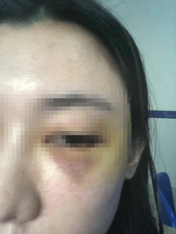 根據(jù)照片顯示,李小姐左眼下有一塊明顯淤青的部位,她表示,這是對(duì)方用手機(jī)尖銳部反復(fù)砸她臉部所受到的傷。因?yàn)槟槻渴軅壳八荒軙和9ぷ鳌?/p>
