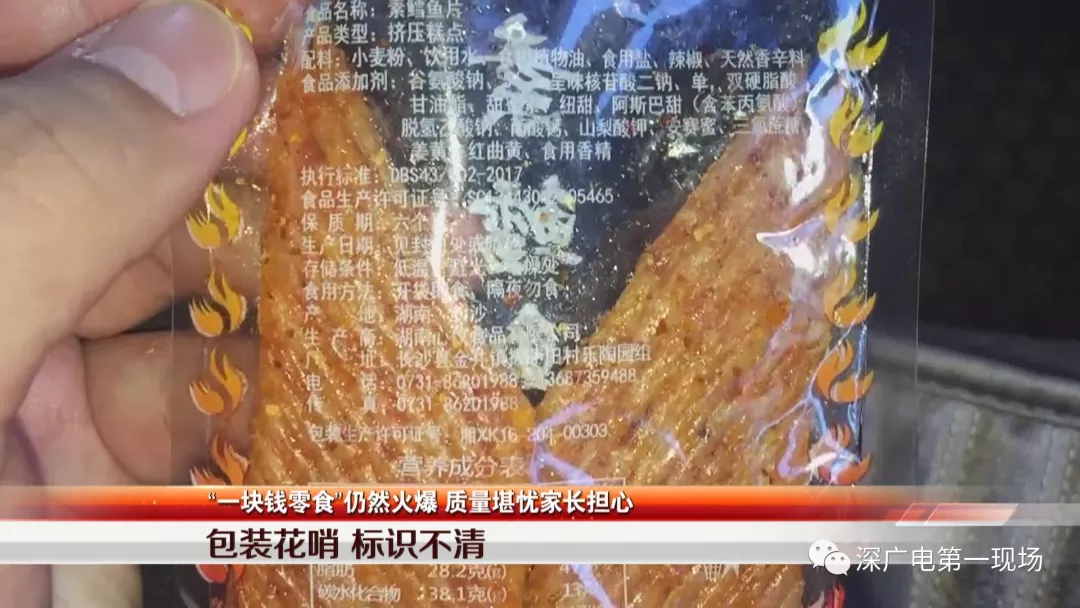 記者在這些食品外包裝上,發(fā)現(xiàn)有一部分包裝上標(biāo)有生產(chǎn)日期、食品生產(chǎn)許可證編號(hào)和廠家地址電話,但也有一部分商品外包裝印刷粗糙,本該清楚標(biāo)明的信息模糊不清,難以辨認(rèn)。
