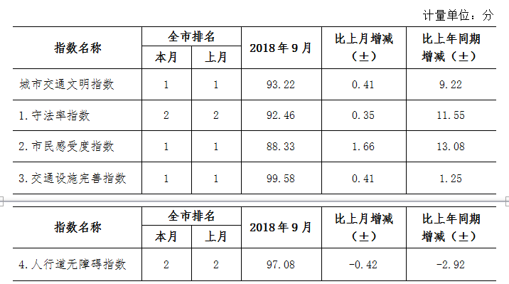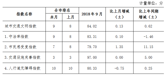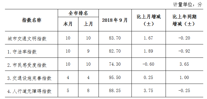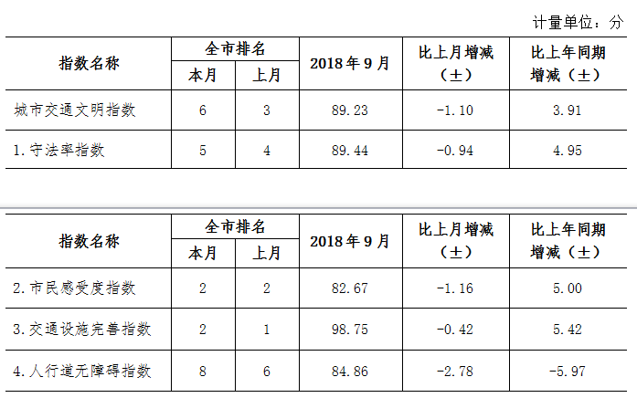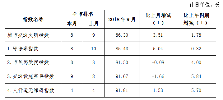 9月份深圳市城市交通文明指數(shù)為87.02分。與上月對比,四項(xiàng)分項(xiàng)指數(shù)呈“三升一降”現(xiàn)象。