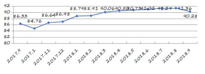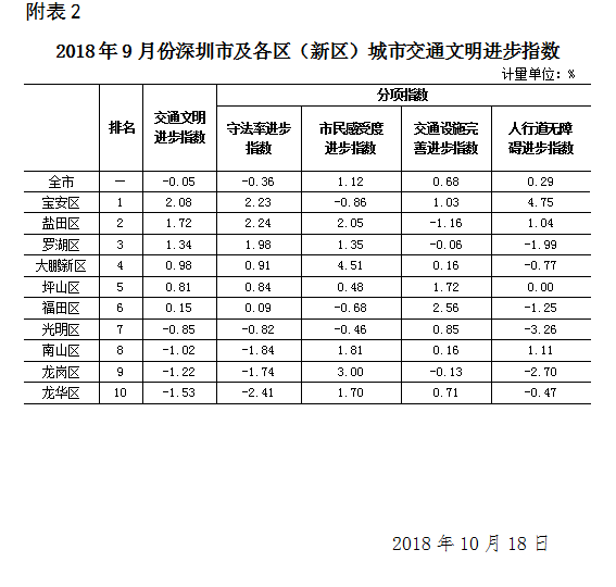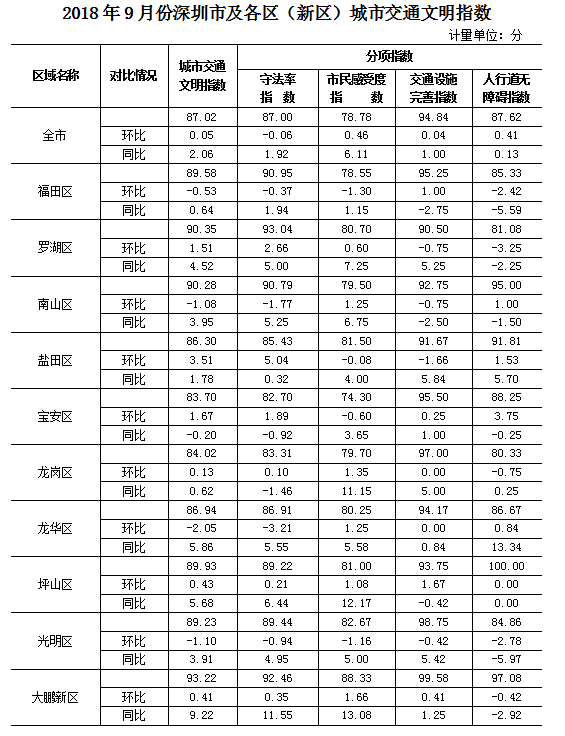 2018年9月份深圳市及各區(qū)(新區(qū))城市交通文明指數(shù)