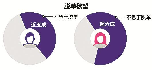 調(diào)查顯示,在脫單欲望方面,近五成單身男性和六成單身女性表示不急于改變單身狀態(tài)。可見,單身男女的脫單欲望正在逐漸下降。