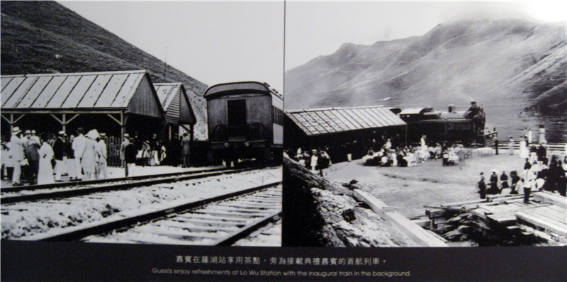 左圖為參加通車(chē)典禮的中英嘉賓在羅湖車(chē)站享用茶點(diǎn)。右圖為首航列車(chē)通過(guò)時(shí)的場(chǎng)景