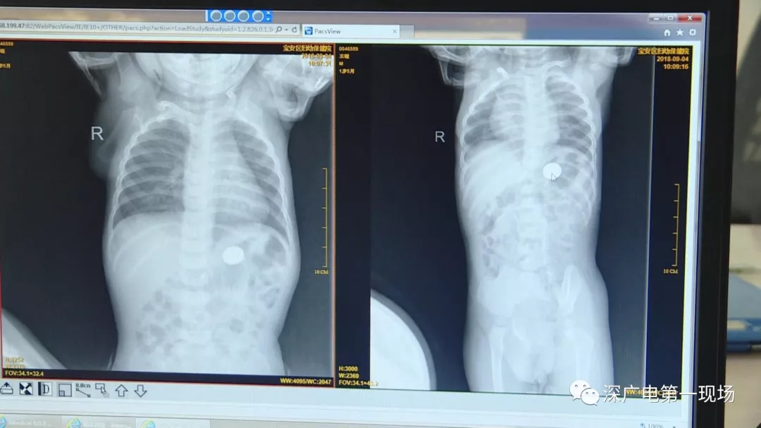 9月4號,一名1歲零5個(gè)月的男嬰因在家中摔傷,被父母送到了寶安區(qū)婦幼保健院,醫(yī)生診斷為左側(cè)尺橈骨骨折。在進(jìn)行全麻手術(shù)之前,院方例行對嬰兒進(jìn)行了周身檢查。手術(shù)前,兒外科醫(yī)生趙冠聰在查看患者的胸片時(shí),發(fā)現(xiàn)這名嬰兒的胃部有一枚硬幣大小的暗影。