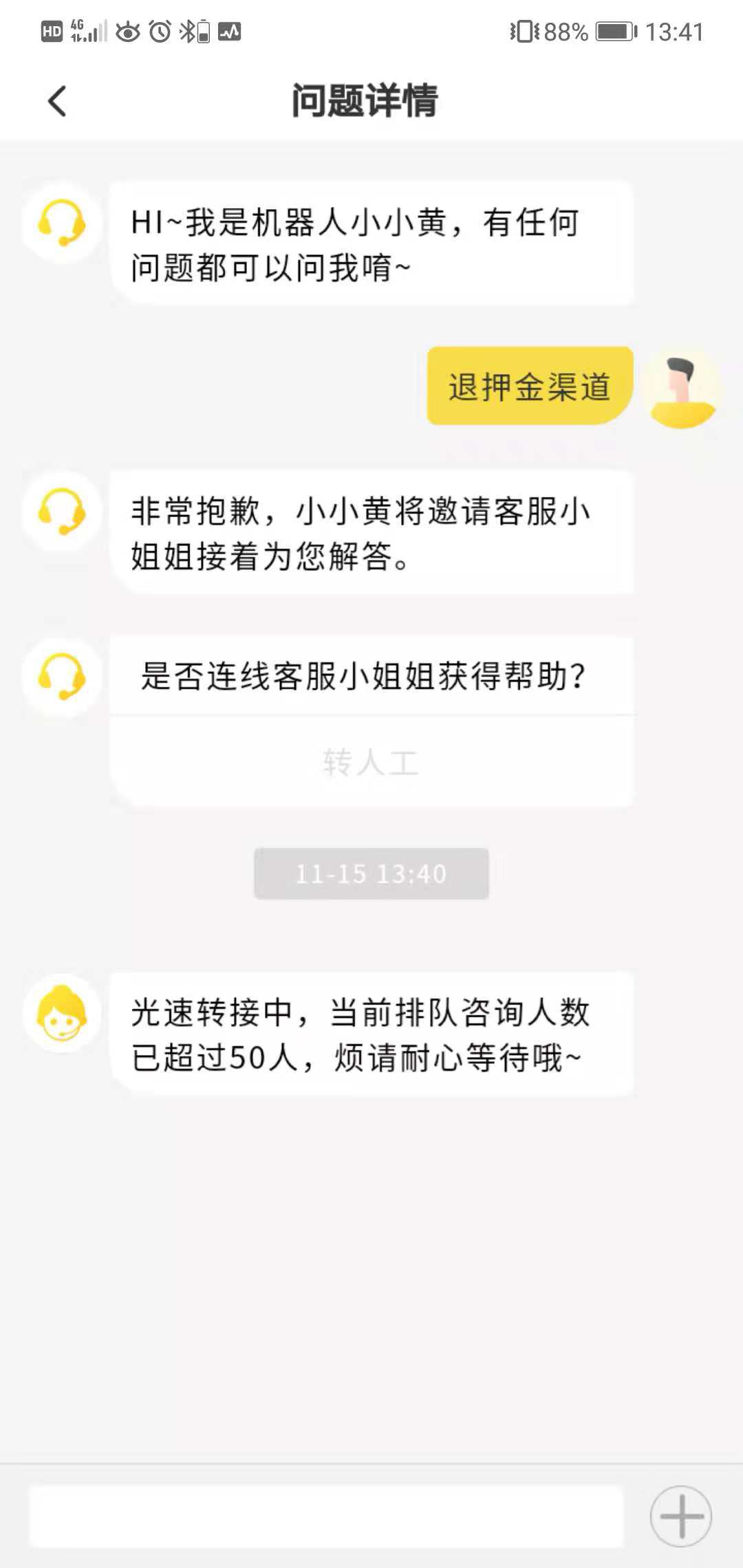 深圳特區(qū)報(bào)2018年11月16日訊“點(diǎn)人工服務(wù)永遠(yuǎn)顯示前面排隊(duì)超過50人,客服電話也打不通?!苯?有市民爆料稱,在ofo平臺退押金實(shí)屬不易。