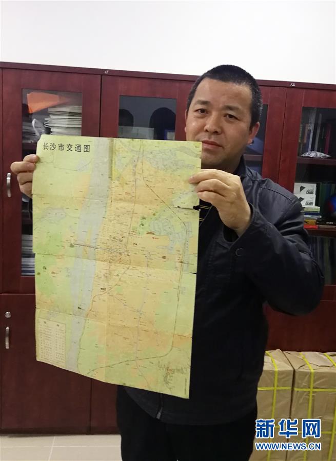 10月23日,蔣連軍向記者展示他收藏的改革開(kāi)放初期的長(zhǎng)沙城區(qū)地圖。 湖南地圖出版社注冊(cè)測(cè)繪師蔣連軍愛(ài)好地圖收藏,累積了40多張40年來(lái)多個(gè)版本的長(zhǎng)沙城區(qū)地圖。10月23日,記者看到了這些地圖,它們直觀呈現(xiàn)了改革開(kāi)放40年來(lái)長(zhǎng)沙城的變遷發(fā)展。 新華社記者 段羨菊 攝