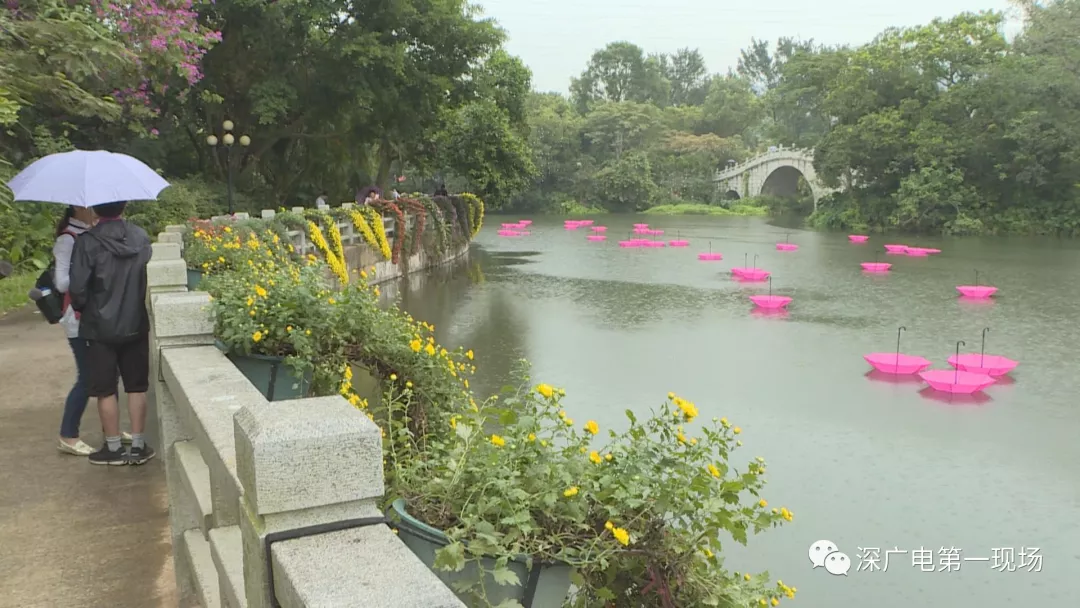 為了讓市民感受到這種小別重逢的驚喜,公園方面準(zhǔn)備了很多新的創(chuàng)意,在沿湖步道布置了400盆懸崖菊,像孔雀尾羽一般垂向水面,湖面上三三兩兩漂浮著粉紅色的雨傘,在雨絲中倒映著湖光山色,別有一番詩(shī)情畫(huà)意。