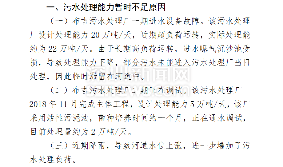 在其復(fù)函中,明確說明了河道黑臭的原因主要為該片區(qū)污水處理能力暫時不足(片區(qū)污水產(chǎn)生量約為26萬噸/天,目前實際污水處理量約為24萬噸/天),為防止生活污水直排下游,臨時設(shè)置橡膠壩,生活污水臨時滯留河道所致。
