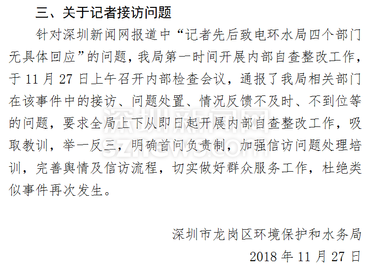 此外,對于前期報道中記者所提及的“先后致電四個部門均無具體回復(fù)”的情況,龍崗區(qū)環(huán)水局也給予了回應(yīng)。他們表示將在日后的工作中完善輿情和信訪流程,切實做好群眾服務(wù)工作。