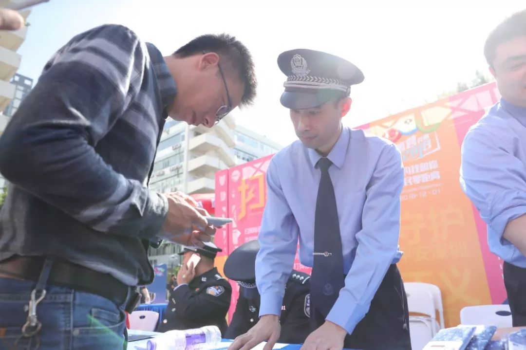 福田公安分局反詐騙宣傳團(tuán)隊開展反詐騙宣傳、互動游戲,通過異形展板、反詐騙海報等,向市民防范宣講常見詐騙手段,群眾紛紛拿起手機(jī)“移形換影”自拍,掃一掃“福田警察”二維碼,加入到反詐騙行動隊伍,為“反詐騙”代言,提高防騙技能。同時,分局法制、經(jīng)偵、禁毒、出入境、戶政等部門現(xiàn)場擺臺,民警一一解答群眾提出的各類咨詢問題。