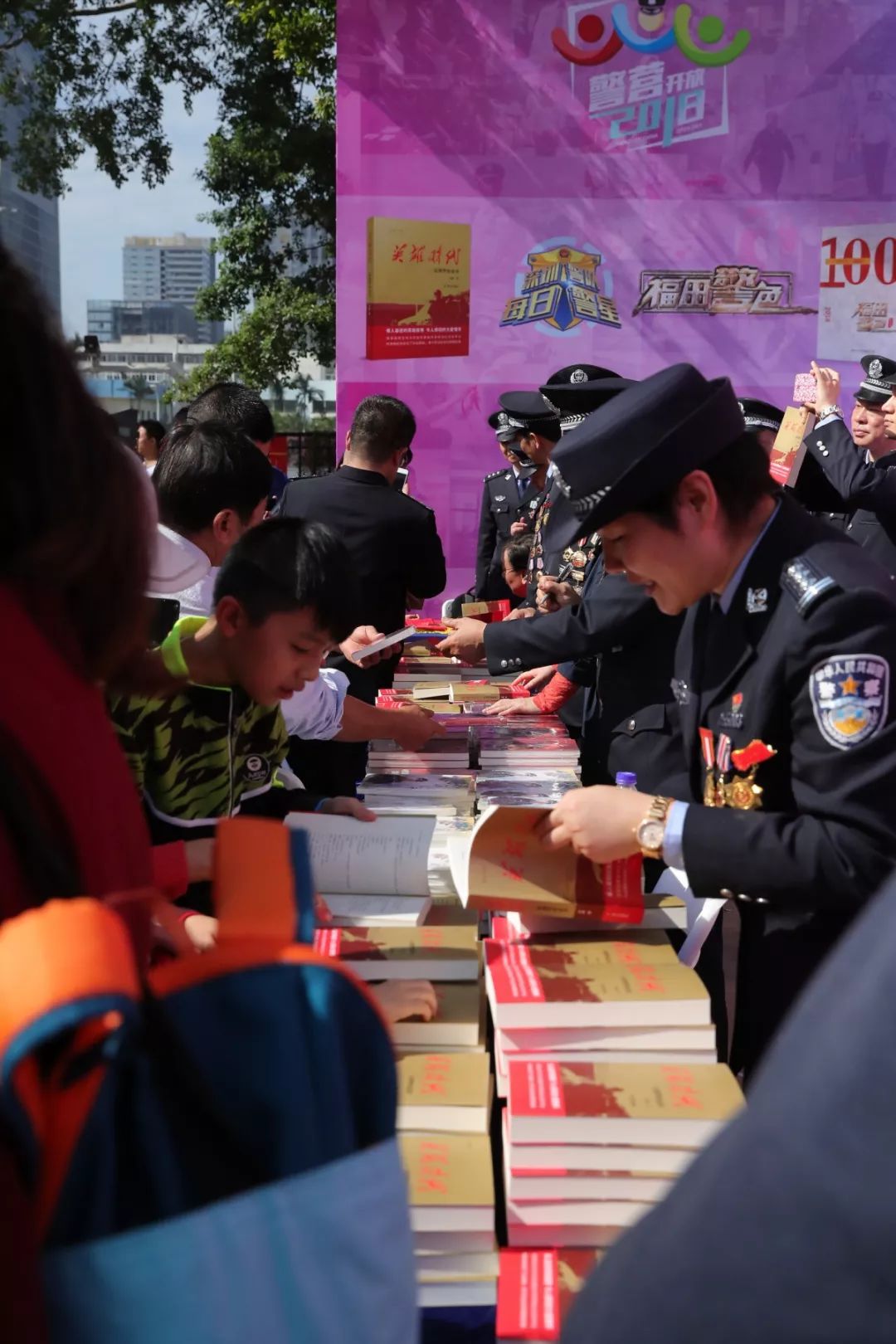 當(dāng)天上午,人民公安出版社副總編李國強(qiáng)、著名作家李迪與市公安局領(lǐng)導(dǎo)來到福田分局開放點(diǎn)現(xiàn)場為深圳公安“每日警星”代表簽名贈(zèng)書。在贈(zèng)書點(diǎn),許多市民排起了長隊(duì),領(lǐng)取《英雄時(shí)代——深圳警察故事》。