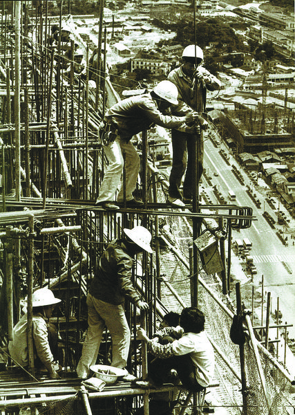 1984年,創(chuàng)造“三天一層樓”的“深圳速度”的國貿(mào)大廈工人。江式高 攝
