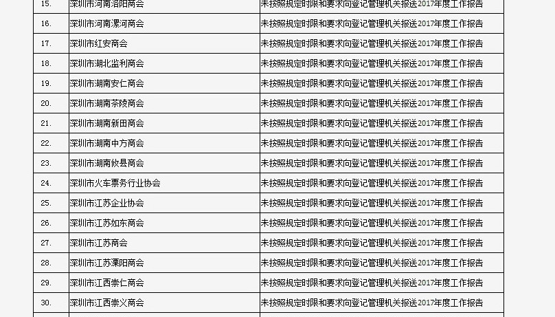 據(jù)深圳市民政局通報(bào),深圳市華中科技大學(xué)校友會(huì)和深圳市深圳大學(xué)校友會(huì)等121家社會(huì)團(tuán)體、深圳市郴州商會(huì)等75家行業(yè)協(xié)會(huì)商會(huì)、企業(yè)家與企業(yè)管理研究院(中國(guó)·深圳)等201家民辦非企業(yè)單位、深圳市明園慈善基金會(huì)等20家基金會(huì),經(jīng)查“未按照規(guī)定時(shí)限和要求向登記管理機(jī)關(guān)報(bào)送2017年度工作報(bào)告”,違反了《社會(huì)組織信用信息管理辦法》《深圳經(jīng)濟(jì)特區(qū)行業(yè)協(xié)會(huì)條例》的相關(guān)規(guī)定,被列入活動(dòng)異常名錄名單。完整版名單已在“深圳民政在線”公布。