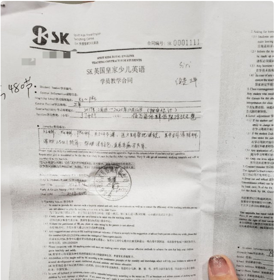 ▲家長提供合同顯示課時和款項