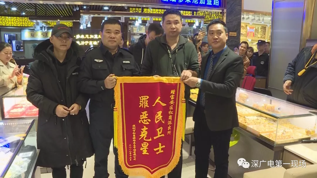 琥珀被盜后的第十天,松崗派出所民警在湖南將嫌疑人沒(méi)來(lái)得及出手的琥珀全部追回。11日上午,松崗派出所民警來(lái)到松崗琥珀交易市場(chǎng),把被盜的琥珀歸還給事主寇先生??芟壬c琥珀交易市場(chǎng)給派出所民警送上錦旗表示感謝。