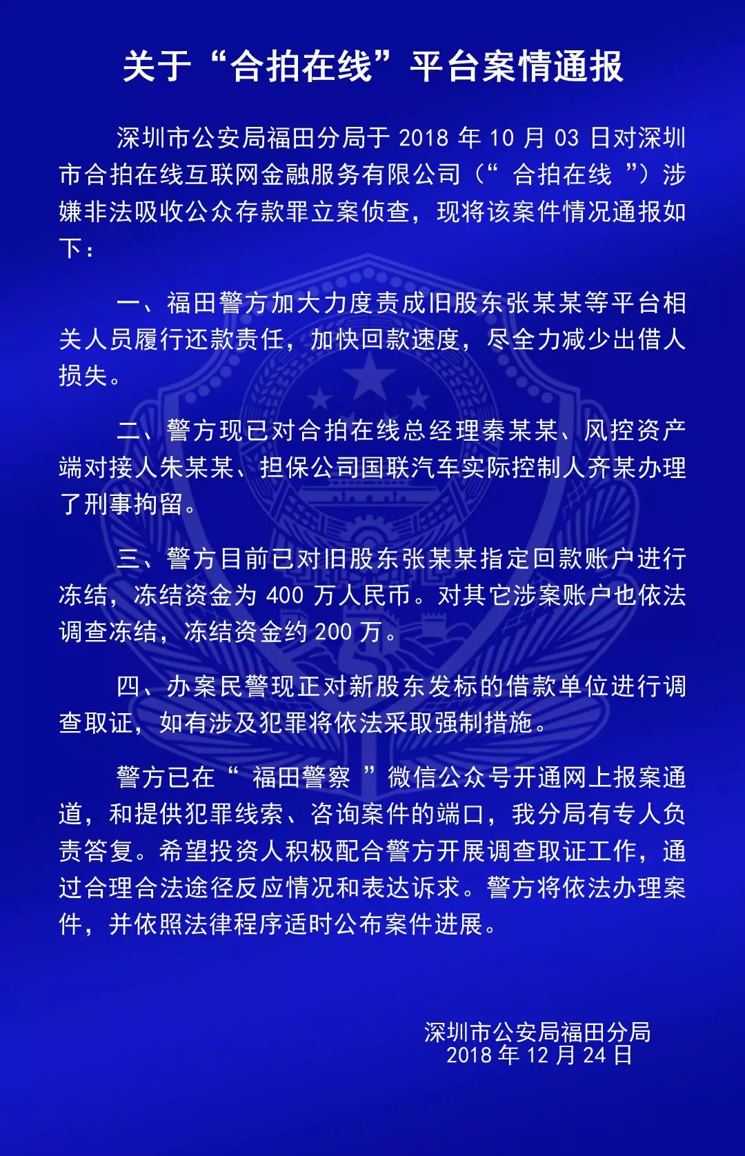 關(guān)于“合拍在線(xiàn)”“壹佰金融”“五星財(cái)富”“眾車(chē)在線(xiàn)”“財(cái)富中國(guó)”“小零錢(qián)”“錢(qián)爸爸”“合時(shí)代”和“前金融”平臺(tái)的案情通報(bào)