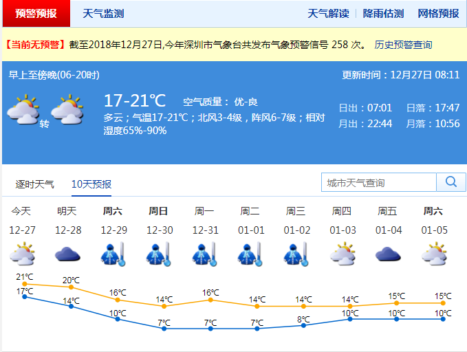 深圳新聞網(wǎng)2018年12月27日訊(記者 施冰冰)記者從市氣象局獲悉,27-28日受寒潮前鋒影響,深圳多云間晴天,風(fēng)力加大,沿海和高地最大陣風(fēng)6-7級,氣溫略降,早晚清涼;29日-元月2日受冷空氣主體影響,氣溫顯著下降,天氣持續(xù)寒冷,最低氣溫7℃左右,并伴有7-9級陣風(fēng)和間中小雨。寒冷和大風(fēng)天氣將持續(xù)5天左右。