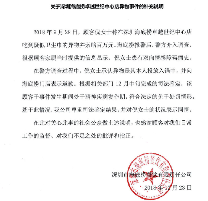 大伙兒還記得深圳海底撈福田卓越店被曝火鍋有衛(wèi)生巾的事兒嗎?