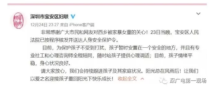 而在稍早前的12月24號,寶安西鄉(xiāng)街道辦發(fā)布的情況通報:寶安區(qū)人民法院于23號晚已經(jīng)簽發(fā)人身安全保護令,目前已經(jīng)送達當事人及轄區(qū)派出所。