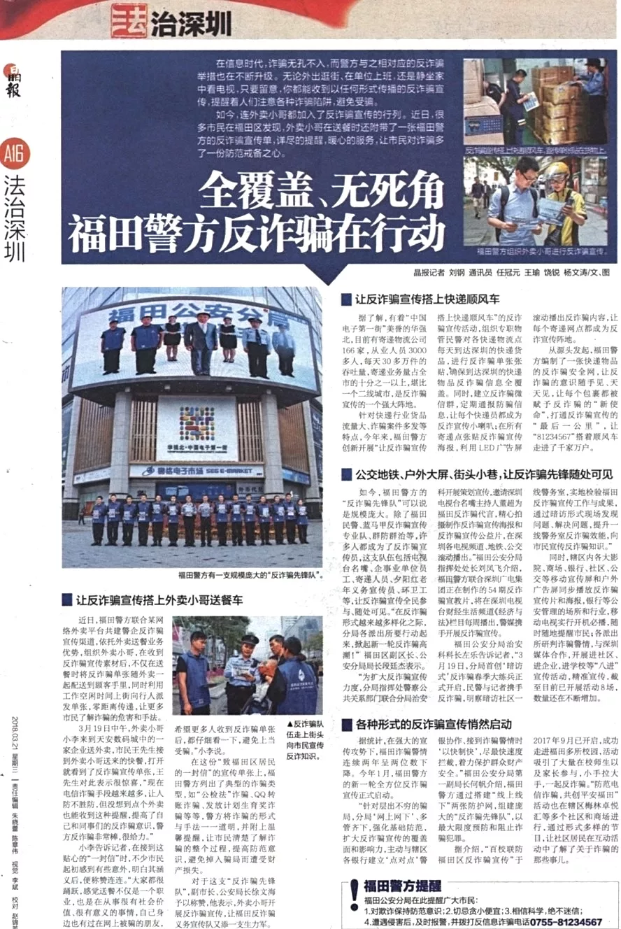 ★★福田警方通過搭建“線上線下”兩張防護網(wǎng),組建龐大的“反詐騙先鋒隊”,多管齊下,擴大反詐騙宣傳的覆蓋面和影響力,最大限度預防和阻止詐騙犯罪。
