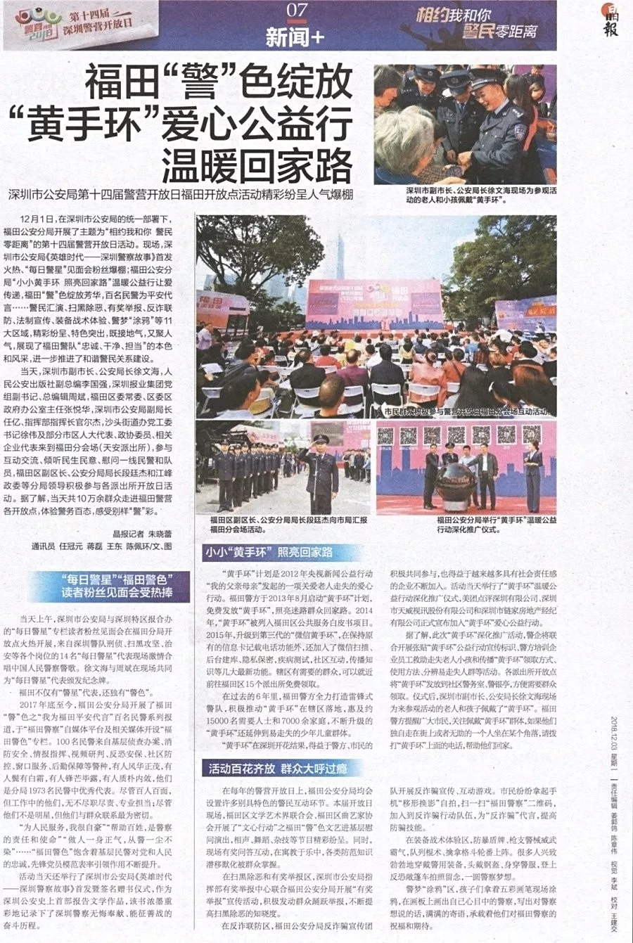 ★★12月1日,在深圳市公安局的統(tǒng)一部署下,福田公安分局開展了主題為“相約我和你警民零距離”的第十四屆警營開放日活動?,F(xiàn)場,深圳市公安局《英雄時代——深圳警察故事》首發(fā)火熱、“每日警星”見面會粉絲爆棚;福田公安分局“小小黃手環(huán)照亮回家路”溫暖公益行讓愛傳遞,福田“警”色綻放芳華、百名民警為平安代言……警民匯演、掃黑除惡、有獎舉報、反詐聯(lián)防、法制宣傳、裝備戰(zhàn)術體驗、警夢涂鴉等11大區(qū)域,精彩紛呈、特色突出,進一步推進了和諧警民關系建設。