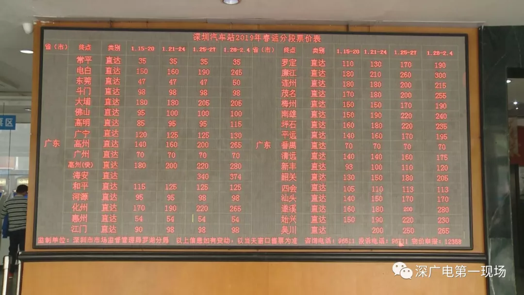 在車站售票廳的票價(jià)顯示屏,不停地滾動(dòng)春運(yùn)期間車站所有線路的票價(jià),均比平時(shí)的票價(jià)有所上浮,但均在上限票價(jià)之內(nèi)。