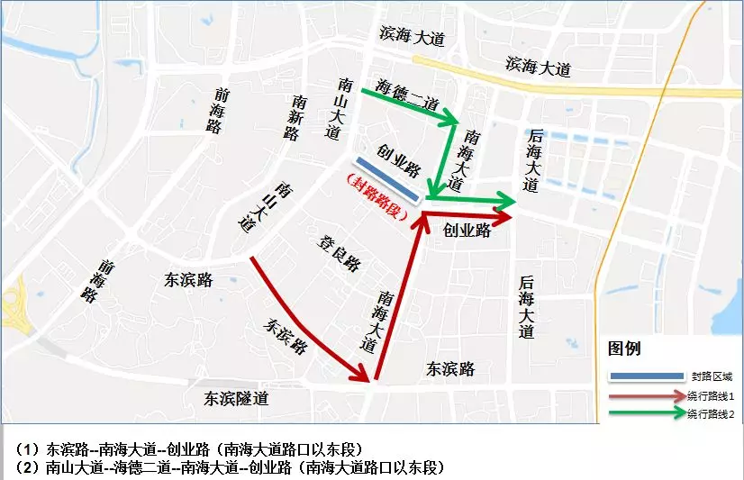 原經(jīng)南海大道創(chuàng)業(yè)路口轉(zhuǎn)入創(chuàng)業(yè)路西行,前往南山大道的車(chē)輛,可按以下路線繞行