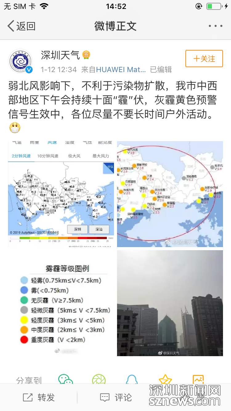 1月12日中午,深圳天氣微博發(fā)布預(yù)警,圖中橙色圓點所在的深圳多個片區(qū)發(fā)生中度灰霾